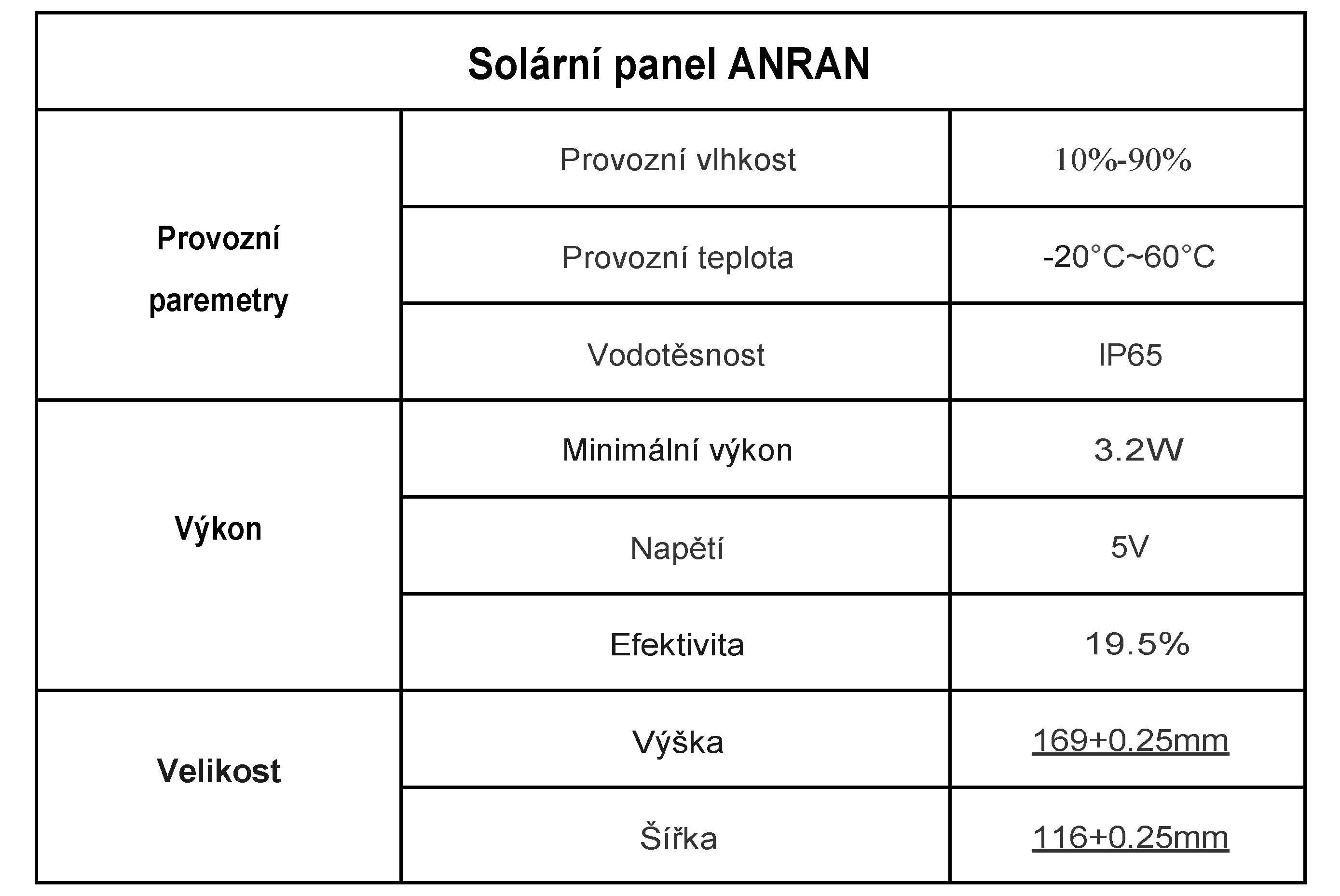 Solárny panel na zálohovanie batérií pre batérie vonkajších bezpečnostných kamier / minimálny výkon 3,2 W / výstupný prúd 5 V / pripojovací kábel s dĺžkou 3 m a konektorom micro USB / rozmery panelu 16,9 x 11,6 cm /