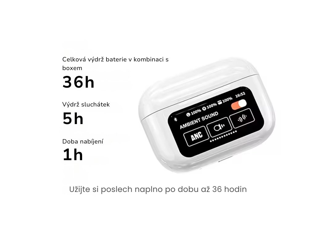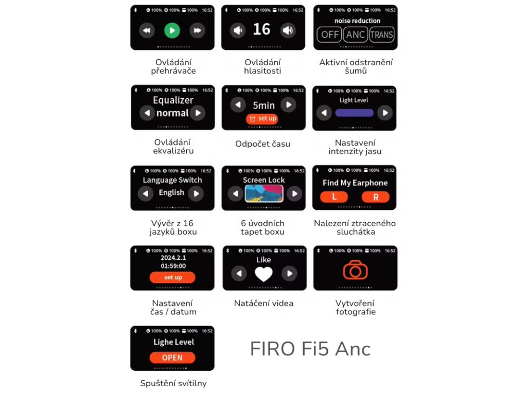 Slúchadlá FIRO Fi5 Anc prináša absolútnu slobodu. Funkcie a nastavenia môžete ovládať bez mobilného telefónu. Prostredníctvom dobíjací box na slúchadlá s dotykovým displejom LCD umožňuje preskakovať skladby, meniť hlasitosť počúvania a volania, nastaviť ekvalizér, aktivovať 4 režimy potlačenia okolitého hluku, používať funkciu nájdenia stratených slúchadiel alebo svietiť baterkou v tme. To všetko bez mobilného telefónu. Slúchadlá vás nikdy nenechajú náhle bez energie. Na domovskej obrazovke nabíjacieho boxu sa vždy zobrazuje aktuálny dátum, čas a stav nabitia slúchadiel a samotného boxu. Nabíjací box je vybavený praktickým a štýlovým pútkom na jednoduché prenášanie.