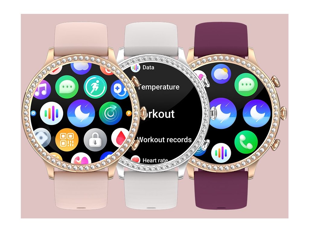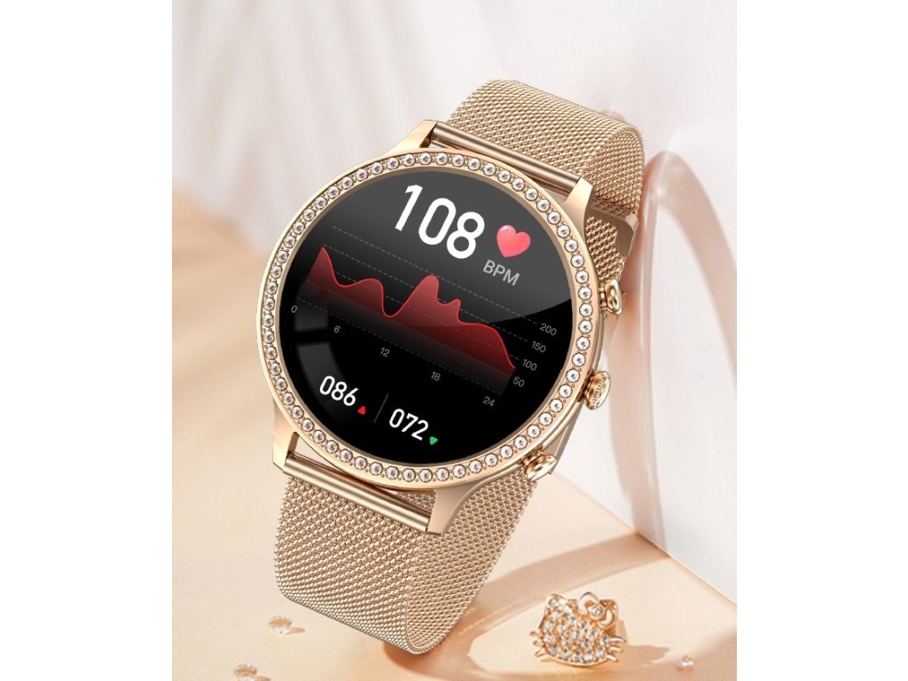 Dámske inteligentné hodinky LUMINA Femi I70 Fit stelesňujú štýl a eleganciu. Prvotriedne spracovanie podčiarkuje kovový ciferník zdobený 60 svietiacimi kryštálmi a vybavený brilantným AMOLED displejom.