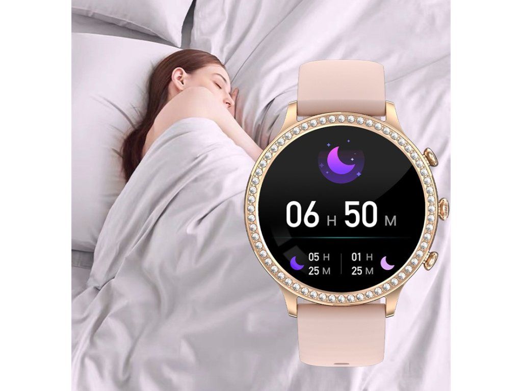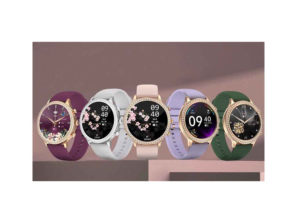 Dámske inteligentné hodinky LUMINA Femi I70 Fit stelesňujú štýl a eleganciu. Prvotriedne spracovanie podčiarkuje kovový ciferník zdobený 60 svietiacimi kryštálmi a vybavený brilantným displejom AMOLED .