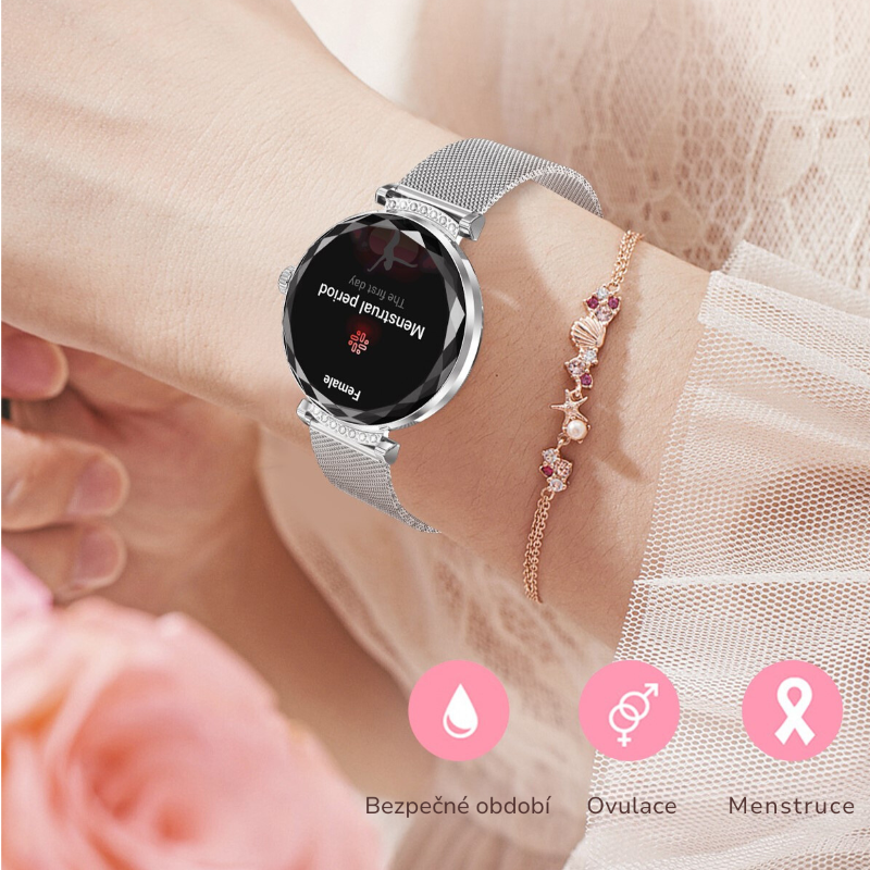 Inteligentné hodinky LUMINA N7 Luna stvorené pre ženy. Ultra tenké kovové telo doplnené AMOLED displejom, jemným oceľovým remienkom a zdobenou korunkou.