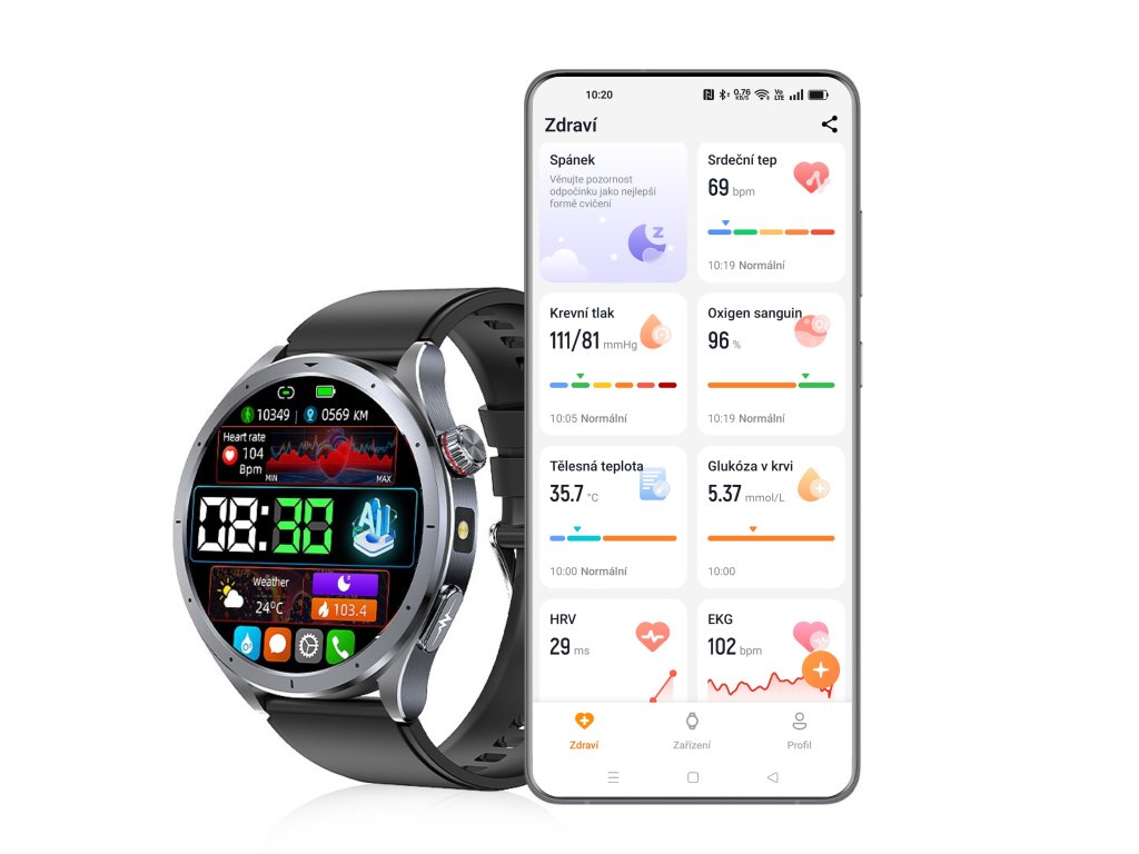 Aktivujte automatické meranie tepovej frekvencie, hladinu cukru v krvi, krvného tlaku, HRV, telesnej teploty, zložiek krvi, stresu a kvality spánku a žite naplno - hodinky všetko strážia za Vás.