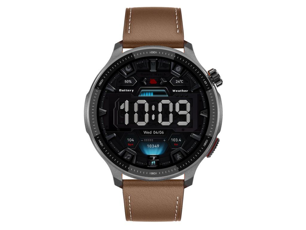 Inteligentné hodinky PulsGo EVOLVE G6 Ultra s elegantným tenkým puzdrom z nehrdzavejúcej ocele, AMOLED displejom a hnedým koženým remienkom.