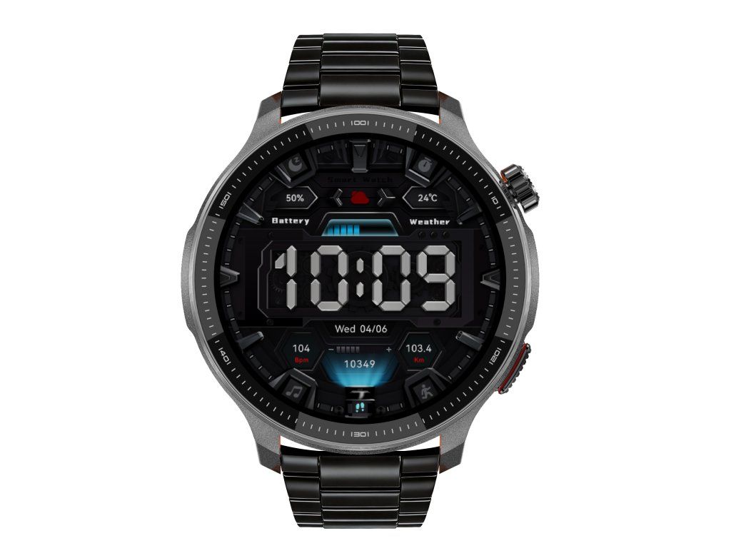 Inteligentné hodinky PulsGo EVOLVE G6 Ultra s elegantným tenkým puzdrom z nehrdzavejúcej ocele, AMOLED displejom a čiernym oceľovým remienkom.