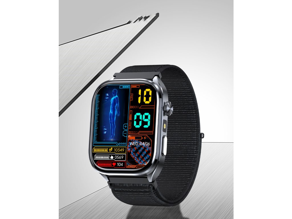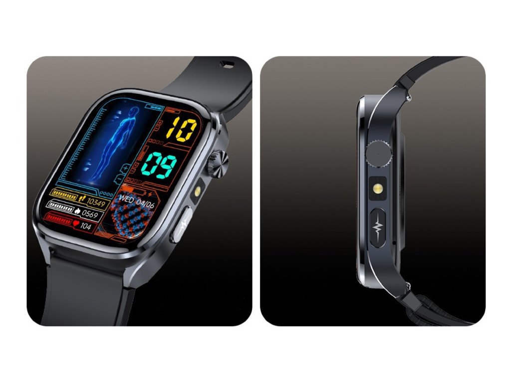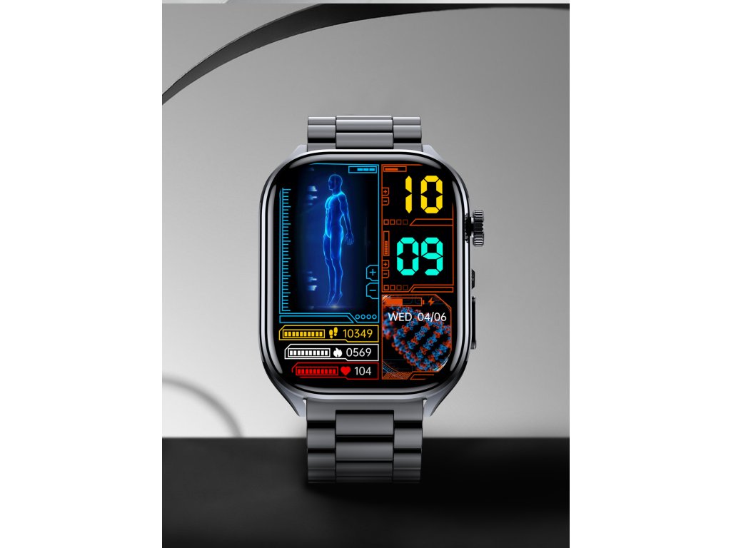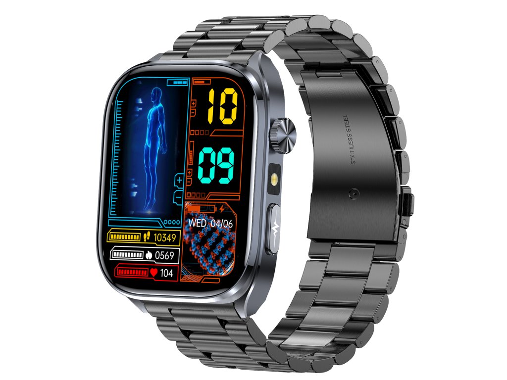 Inteligentné hodinky PulsGo Zdravie ET572 pre kondíciu s funkciami na detailné meranie a analýzu pohybu aj zdravia. Neinvazívne meranie hladiny cukru v krvi, srdcového tepu, HRV, krvného tlaku, EKG, zložiek krvi, zloženia tela, telesnej teploty, stresu, rýchlosti metabolizmu, okysličenia krvi a kvality spánku.