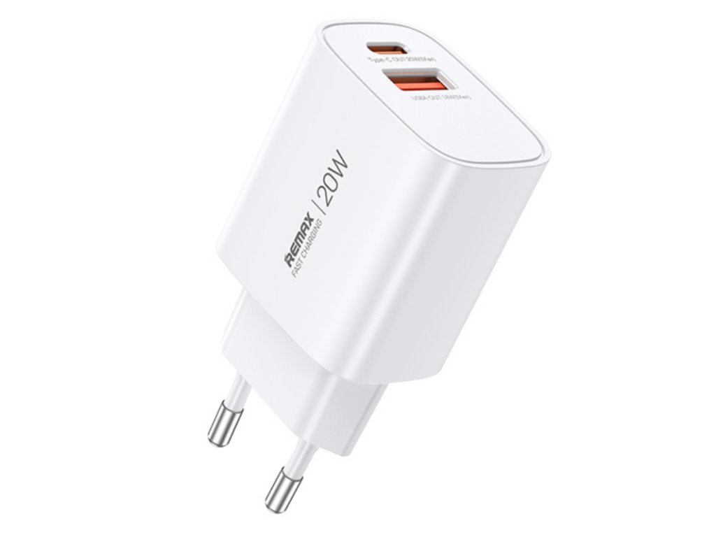 Napájací adaptér REMAX U187-C20W s dvoma napájacími portami USB-A a USB-C. Podpora Quick Charge 3.0 (QC 3.0) a Power Delivery 20W (PD20W)