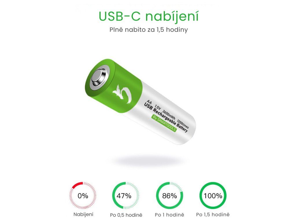 Smartools AA dobíjacia batéria 1,5 V, 2600mWh, Li-Ion, USB-C dobíjanie, 1200 cyklov, 4 kusy v balení