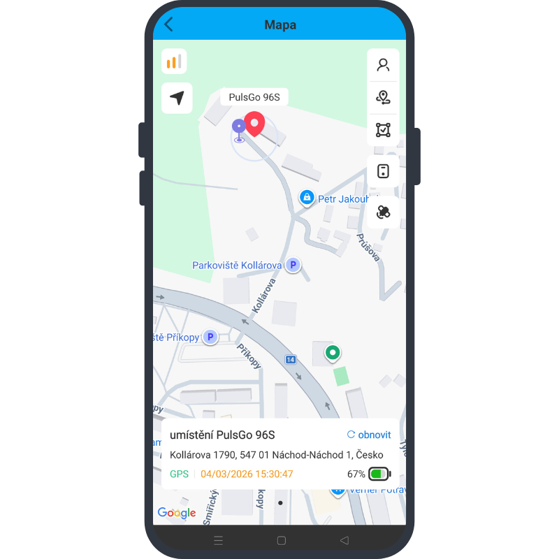 S inteligentnými hodinkami PulsGo ACTIVE 96S máte vždy prehľad o tom, kde sa vaši blízki práve nachádzajú. Hodinky využívajú kombináciu technológií GPS a Beidou, ktoré spoločne zaisťujú presné určenie polohy v reálnom čase s presnosťou na jednotky metrov. Vďaka tomu je možné polohu zobraziť priamo v mobilnej aplikácii na Google mapách a kedykoľvek rýchlo zistiť, či je všetko v poriadku.