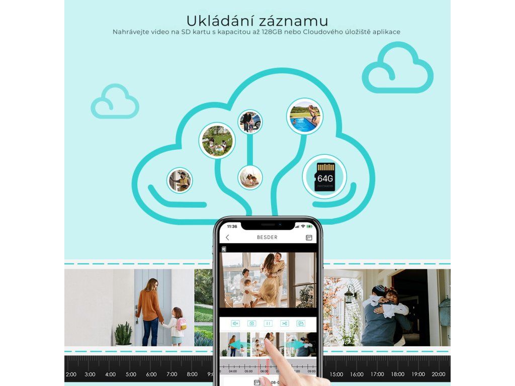 Nahrávanie možno vykonávať 24 hodín denne, 7 dní v týždni na kartu micro SD s kapacitou až 128 GB alebo aktivovať cloudové úložisko v mobilnej aplikácii (cloudové úložisko je spoplatnené).