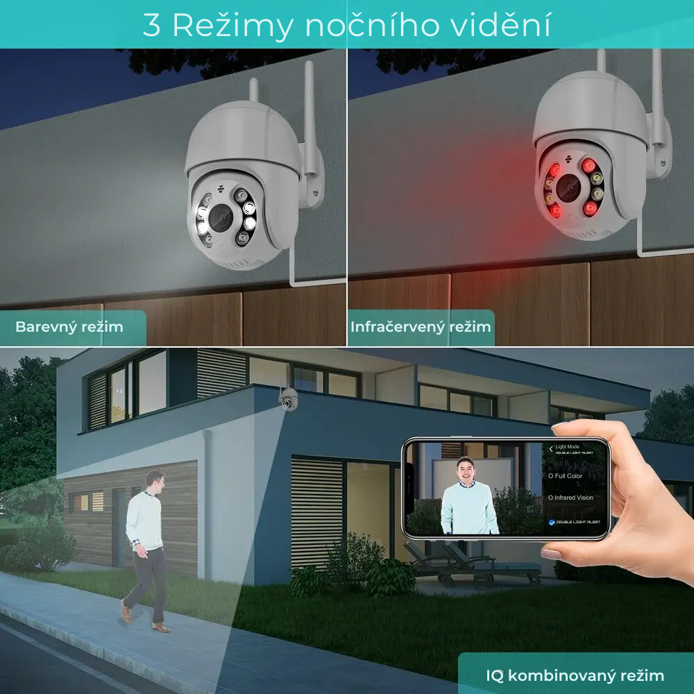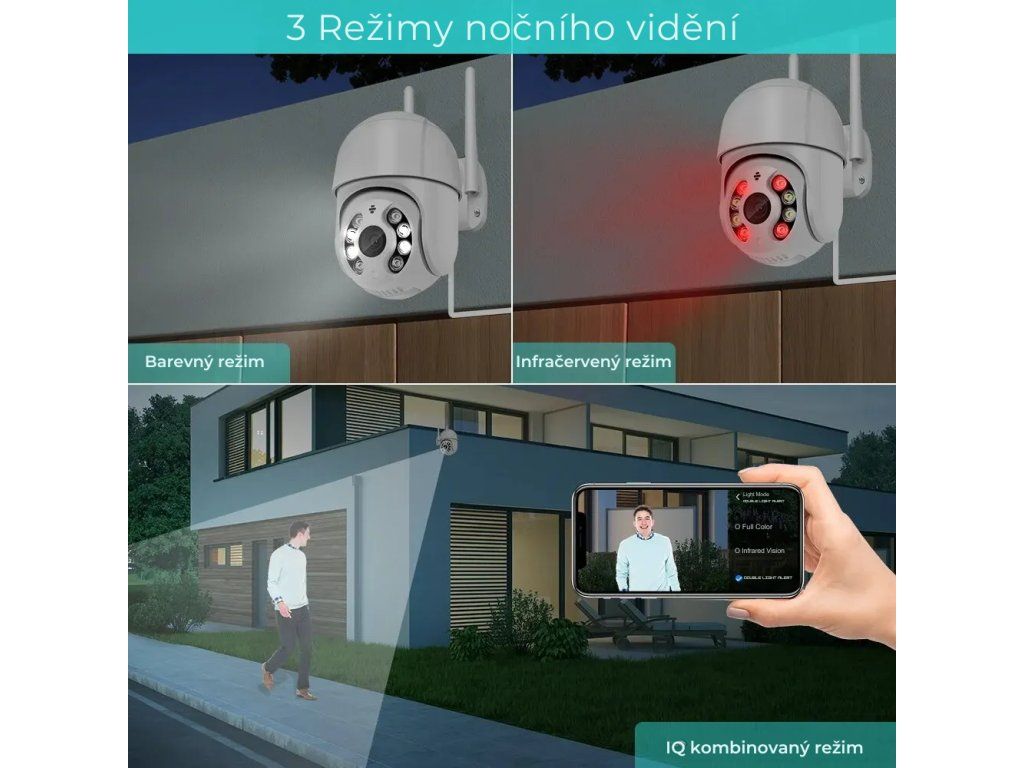 - Inteligentný režim - fotoaparát používa infračervené osvetlenie a zachytáva čiernobiele snímky. Hneď ako zistí pohyb, automaticky zapne osvetlenie LED a zaznamená farebný obraz.